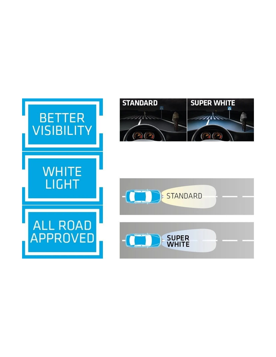 SUPER WHITE ksenono efekto halogeninės lemputės pagamintos iš mėlynai tonuoto stiklo su filtru, kuris pašalina geltoną spalvą ir leidžia išgauti dienos šviesai artimą šviesos spalvą. Šis efektas efektyviai pagerina saugumą ir komfortą vairuojant naktį, leidžia lengviau matyti detales ir spalvas kelyje, taip pat suteikia palengvėjimą akims ilgų kelionių metu. Puikus stiliaus ir saugumo derinys.