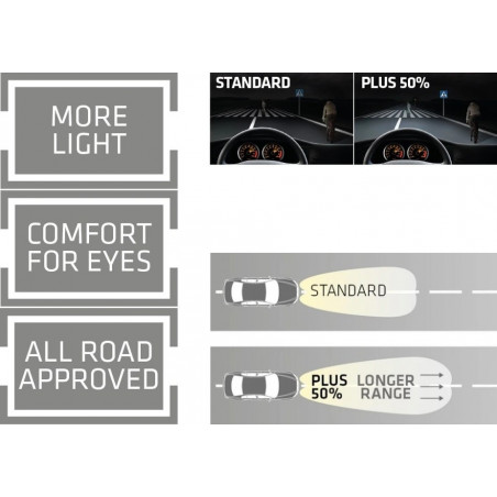 PLUS 50% dvigubos apsaugos halogeninės lemputės buvo sukurtos galvojant apie pagerėjusį matomumą vairuojant. Dėl specialios kaitinimo siūlelio konstrukcijos šviesos srautas maždaug 75 metrų atstumu priešais automobilį yra daugiau nei 50% didesnis, palyginti su standartinėmis lemputėmis. Tai leidžia vairuotojui žymiai greičiau reaguoti ir geriau apšviesti kelią naktį ir sudėtingomis oro sąlygomis.