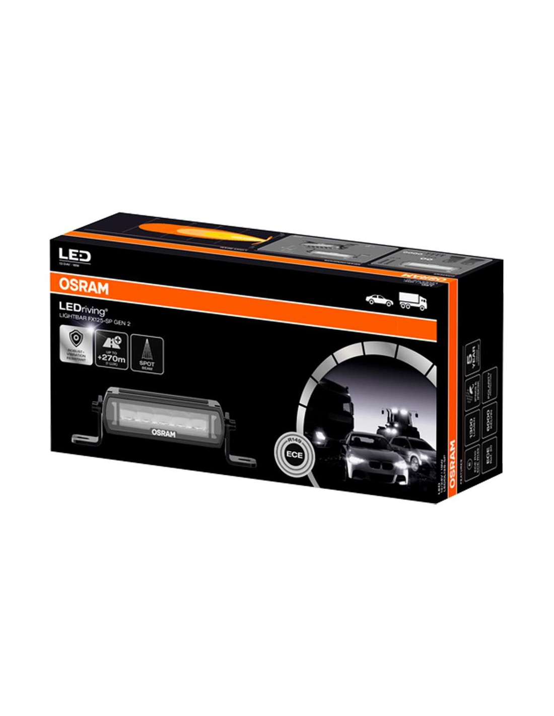 Padidintas ryškumas apšviečiant tolimus ir artimus laukus. Ypač važiuojant kaimo ir žvyrkeliais, didesnis matomumo diapazonas gali atlikti svarbų vaidmenį užtikrinant saugumą. „LEDriving Lightbar FX125-SP GEN 2“ užtikrina papildomą, artimą ir tolimą apšvietimą tamsiuose keliuose, kurio šviesos srautas siekia iki 1300 liumenų. Net ir esant prastam matomumui ar prieblandoje, 5 didelio našumo LED diodai apšviečia iki 270 metrų atstumą ir užtikrina 6000 kelvinų spalvos temperatūrą dienos apšvietimu. Tolimųjų šviesų žibintai žavi specialiu reflektoriaus dizainu ir užtikrina ne tik modernią bei patrauklią išvaizdą, bet ir sumažina akinimą, kad būtų užtikrintas geresnis matomumas kelyje. Juos galima naudoti tiek kaip papildomus LED tolimųjų šviesų žibintus, tiek kaip galingus darbinius žibintus. Abiejų versijų žibintai visiškai atitinka ECE reikalavimus, todėl tinka naudoti keliuose.