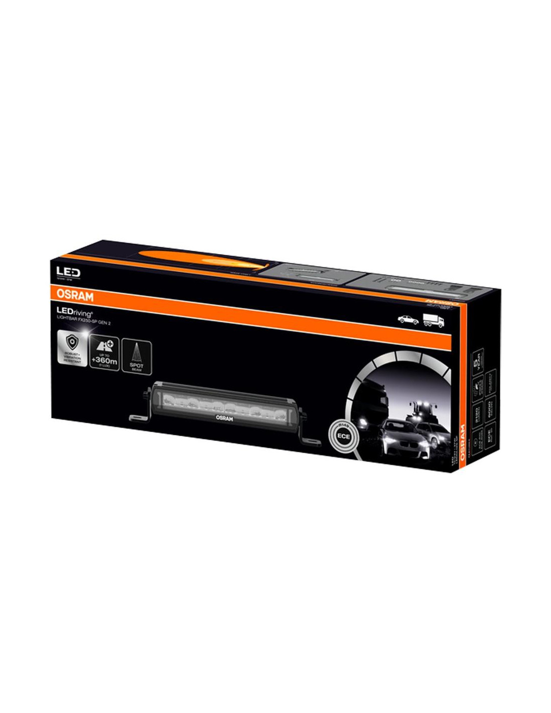 Padidintas ryškumas apšviečiant tolimus ir artimus laukus. Ypač važiuojant kaimo ir žvyrkeliais, didesnis matomumo diapazonas gali atlikti svarbų vaidmenį užtikrinant saugumą. „LEDriving Lightbar FX250-SP GEN 2“ užtikrina papildomą apšvietimą iš arti ir toli tamsiuose keliuose iki 2120 liumenų. Net ir esant prastam matomumui ar prieblandoje, 10 didelio našumo LED diodų apšviečia iki 360 metrų atstumą ir užtikrina 6000 kelvinų spalvos temperatūrą dienos apšvietimu. Tolimųjų šviesų žibintai žavi specialiu reflektoriaus dizainu ir užtikrina ne tik modernią ir patrauklią išvaizdą, bet ir sumažina akinimą, kad būtų užtikrintas geresnis matomumas kelyje. Juos galima naudoti tiek kaip papildomus LED tolimųjų šviesų žibintus, tiek kaip galingus darbinius žibintus. Abiejų versijų žibintai visiškai atitinka ECE reikalavimus, todėl tinka naudoti keliuose.