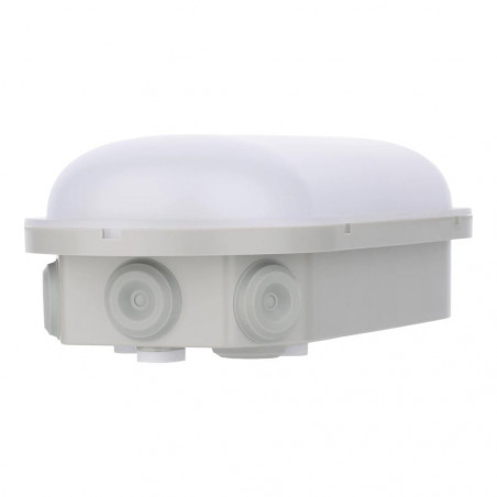 Šis tipinis sieninis arba rūsio šviestuvas dar vadinamas „Bulleye“, „Bully“, „Bulkhead“ arba „Hublot“. Šviesiai pilkas korpusas ir matinės baltos spalvos difuzorius pagaminti iš tvirto, UV spinduliams atsparaus plastiko (IK07). Šio „Bulkhead“ ypatingumas yra tas, kad jis turi 2 jungiklio funkcijas. Tai leidžia iš anksto nustatyti galios suvartojimą (6 W-9 W-15 W, kuris lemia šviesos intensyvumą) ir šviesos spalvą (3000 K šiltai balta ir 4000 K šaltai balta). Tai labai praktiška, jei norite turėti galimybę pasirinkti geriausią variantą vietoje. Yra ne mažiau kaip 6 kabelių įvadai, todėl tiekimas, tiek išvedimas nesukelia problemų. Apsaugos klasė (IP54). Šis energiją taupantis šviestuvas tiekiamas be kabelio ir yra lengvai montuojamas. Tipinės taikymo sritys: rūsiai, portalai, priešgaisrinės juostos, sandėliukai, dirbtuvės ir garažai.