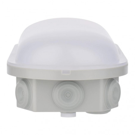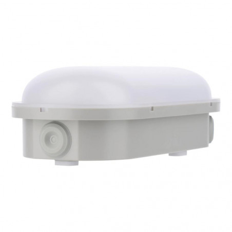 Šis tipiškas „Motin“ jutiklio sieninis šviestuvas arba rūsio šviestuvas taip pat vadinamas „Bulleye“, „Bully“, „Bulkhead“ arba „Hublot“. Šviesiai pilkas korpusas ir matinės baltos spalvos difuzorius pagaminti iš tvirto UV spinduliams atsparaus plastiko (IK07). Šio „Bulkhead“ ypatumas yra tas, kad jame yra 5 DIP jungikliai, kuriais galite nustatyti diapazoną, laikymo laiką ir dienos šviesos jutiklį. Be to, yra 2 jungiklio funkcijos, kuriomis iš anksto galima nustatyti galios suvartojimą (7 W, 10 W arba 16 W, kuris lemia šviesos intensyvumą) ir šviesos spalvą (3000 K šiltai balta ir 4000 K šaltai balta). Tai labai praktiška, jei norite turėti galimybę pasirinkti geriausią variantą vietoje. Yra ne mažiau kaip 6 kabelių įvadai, todėl maitinimas ir kilpų sujungimas nesukelia problemų. Apsaugos klasė (IP54). Šis energiją taupantis šviestuvas tiekiamas be kabelio ir yra lengvai surenkamas. Tipinės taikymo sritys: rūsiai, portalai, gaisrinės, sandėliukai, dirbtuvės ir garažai. Aplinkos temperatūra: nuo -20 C iki +40 C.