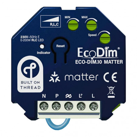 „ECO-DIM.10 Matter“ yra 0–250 W galios pritemdymo modulis, tinkantis abiem pritemdymo technikoms (RLC). Šį modulį galima valdyti pasirinkta namų automatikos sistema ir (arba) vienu ar keliais mygtukais. Montavimas gali būti atliekamas naudojant 2 laidus (galima prijungti neutralų laidą). Montavimo gylis yra tik 19,8 mm. Modulis turi MIN, MAX (optimaliam pritemdymui) ir Speed (pritemdymo greičiui) reguliavimo funkcijas. „Matter“ yra išmaniųjų namų ateitis ir tinka visoms pirmaujančioms namų automatikos sistemoms. Norėdami valdyti „Matter“ pritemdiklį, turite turėti sriegių kraštų frezą. Šie įrenginiai turi sriegių kraštų frezą. „HomePod 2023“, „HomePod mini“ (visi modeliai), „Apple TV 4K“ (2-os kartos), „Apple TV 4K“ (3-ios kartos su 128 GB atminties), „Homey Pro“, „Nanoleaf Shapes, Lines and Essentials“, „Amazon Eero 6“ / „6 Pro“ / „Beacon“, „Google Nest Hub“ (2-os kartos), „Google Nest Hub Max“, „Google Nest WiFi“, „Amazon Echo“ (4-os kartos), „SmartThings Hub v3“ / „SmartThings Station“.