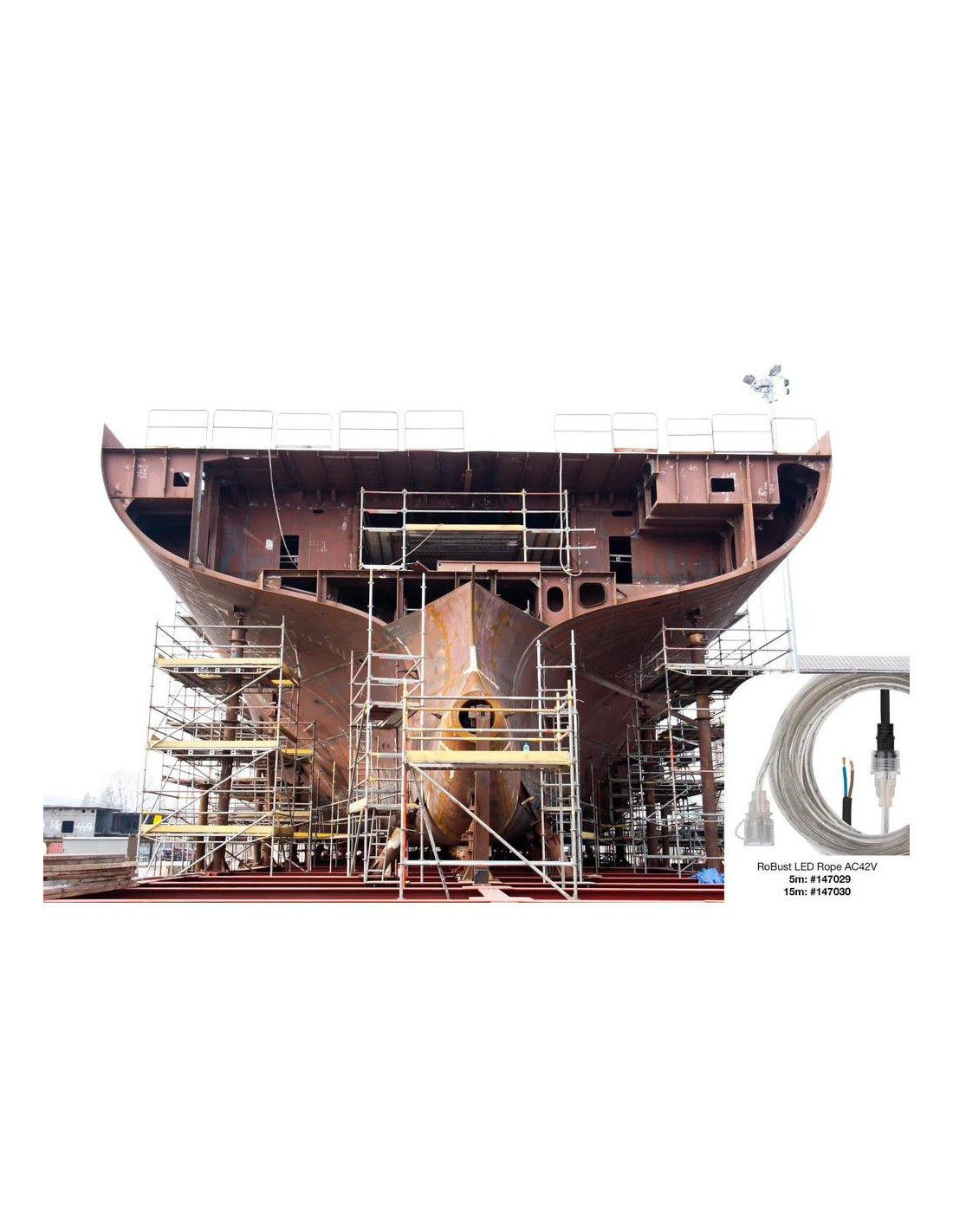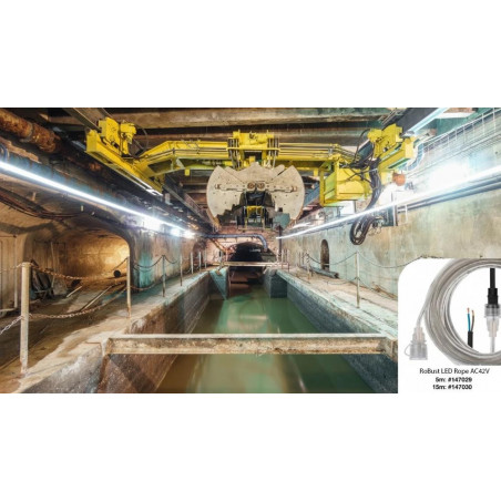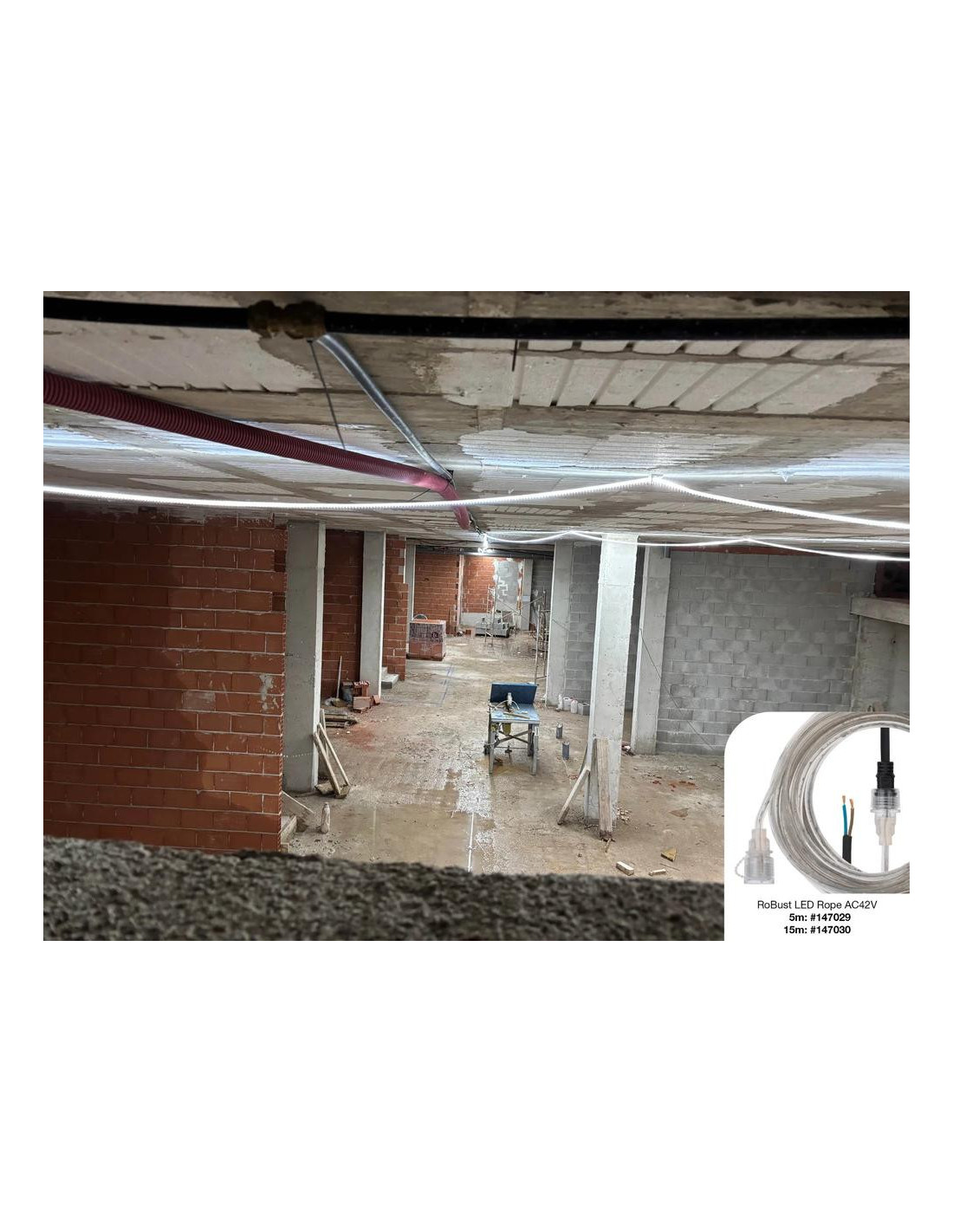 „Robust LED Rope AC42V“ virvė yra plačios „Bailey Robust Rope Plus“ serijos dalis. Ši 5 metrų ilgio žemos įtampos (42 V AC) LED šviesos virvė skirta saugiam naudojimui drėgnoje arba laidžioje aplinkoje, pavyzdžiui, požeminėse patalpose, kanalizacijoje, rūsiuose, plieniniuose laivuose, katiluose ir rezervuaruose. Prie virvės pridedamas 1,8 metro ilgio jungiamasis laidas BE kištuko. Montavimui reikalingas CEE kištukas 16A 2P 42V (pvz., „Bailey“, prekės nr. 147038) ir apsauginis transformatorius (42 V AC išvestis). Turėdama 60 šviesos diodų metre (450 lm/m, 4000 K), ji užtikrina ryškią ir pastovią šviesos kokybę. Dėl lieto PVC korpuso ji atspari smūgiams ir vandeniui (IK10, IP65). Galima prailginti iki 60 metrų ir prireikus lengvai sutrumpinti. Tinka temperatūrai nuo -20 C iki +40 C.