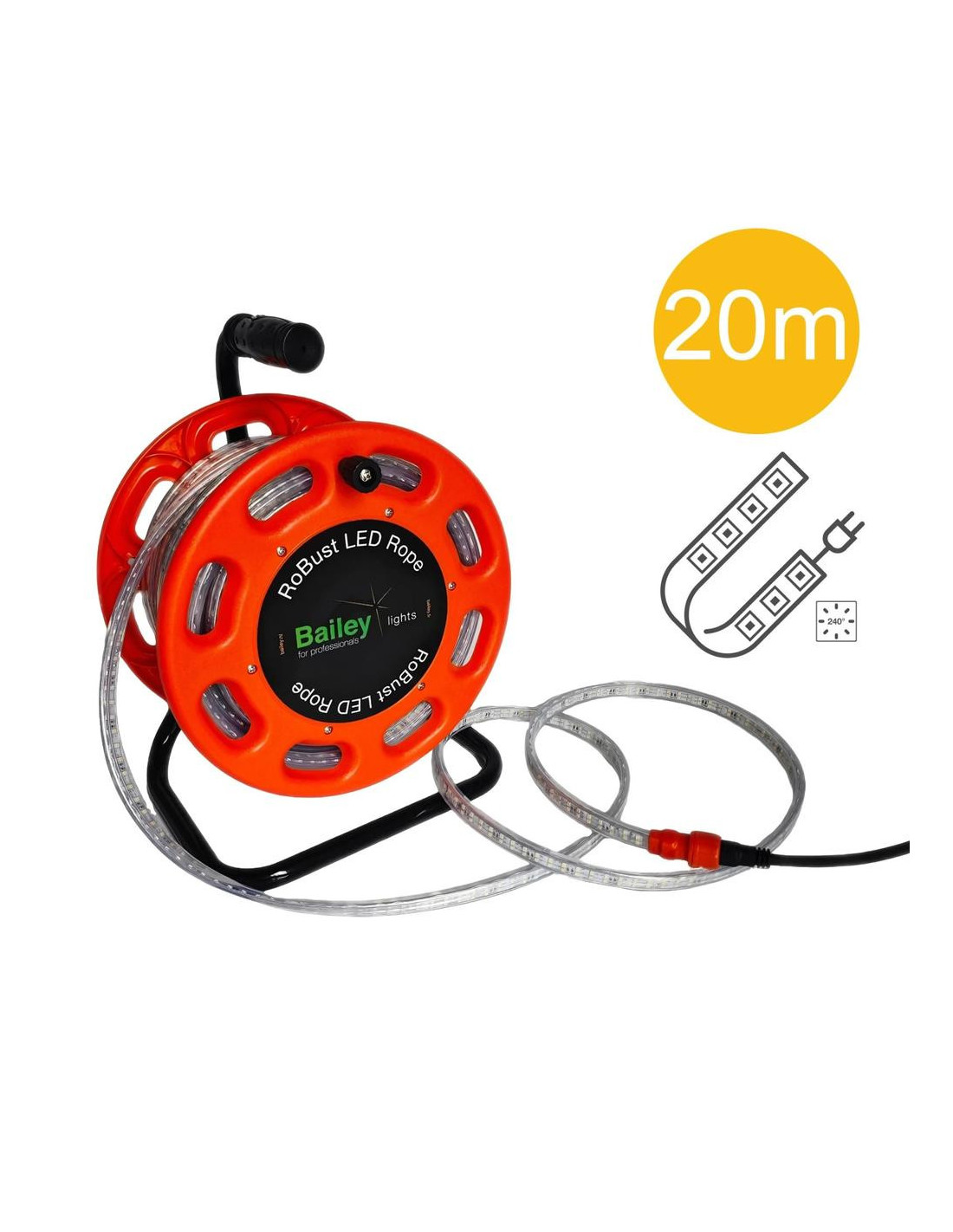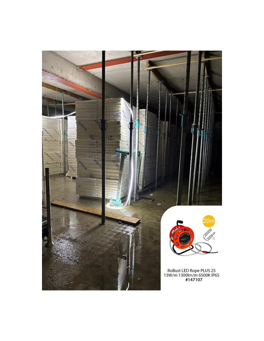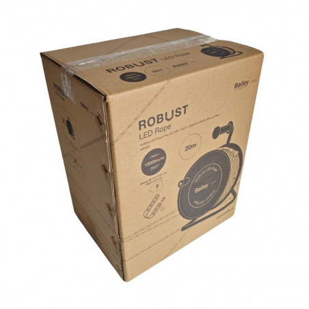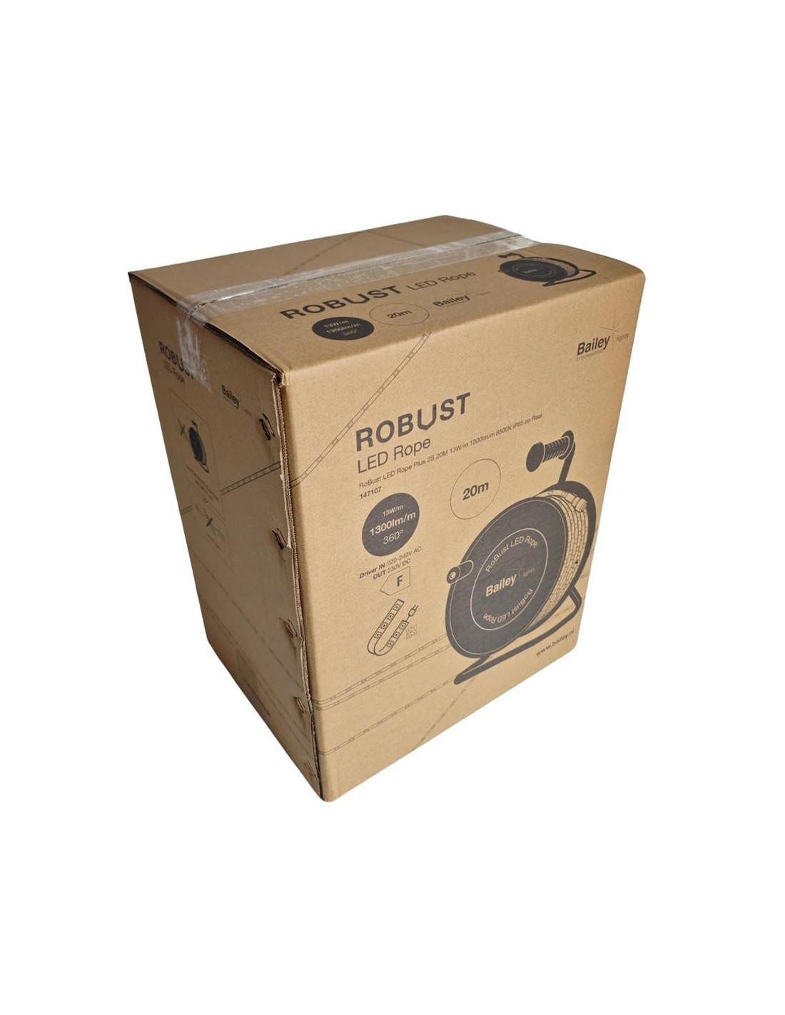 „Robust LED Rope Plus“ – galingas, patvarus ir lankstus darbo apšvietimas. „Robust LED Rope Plus 2S“ yra patikimos „Bailey Robust“ serijos dalis. Ši tvirta 20 metrų šviesos virvė specialiai sukurta statybvietėms, tamsioms vietoms ir pramoninėms darbo vietoms. Turėdama 360 šviesos diodų metre (1300 lm/m, 6500 K), ji užtikrina galingą, ryškų 240° darbo apšvietimą. Dėl lieto PVC korpuso šviesos virvė yra atspari smūgiams (IK10) ir visiškai atspari vandeniui (IP65). Virvė suvyniota ant išskirtinės ir praktiškos oranžinės ritės, todėl ją lengva pasiimti su savimi į kitą darbą. Virvę lengva prijungti ir ji tiekiama su 230 V maitinimo šaltiniu, įskaitant įmontuotą AC/DC adapterį ir 1,8 metro prijungimo laidą. Ją galima sutrumpinti naudojant standartinius PVC klijus ir atitinkamą galinį dangtelį. Galima įsigyti įvairių priedų: skirstytuvus, avarinį įrenginį, judesio jutiklį. Tinka temperatūrai nuo -20 °C iki +45 °C ir gali būti prijungta iki 100 m atstumu. Pastaba: prieš naudojimą visada visiškai išvyniokite, kad išvengtumėte perkaitimo.