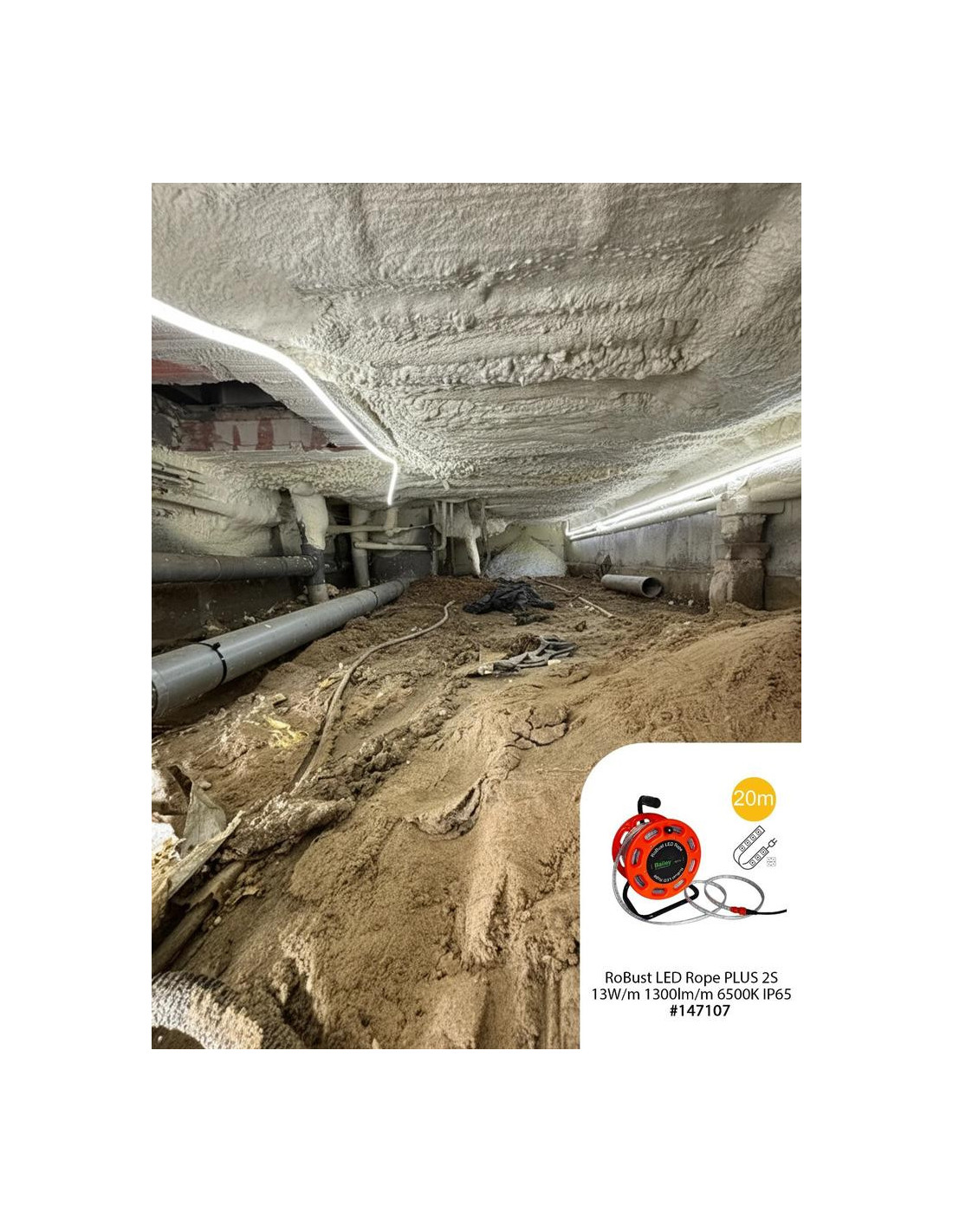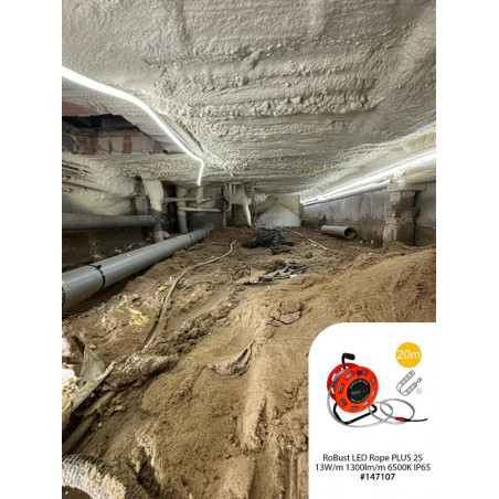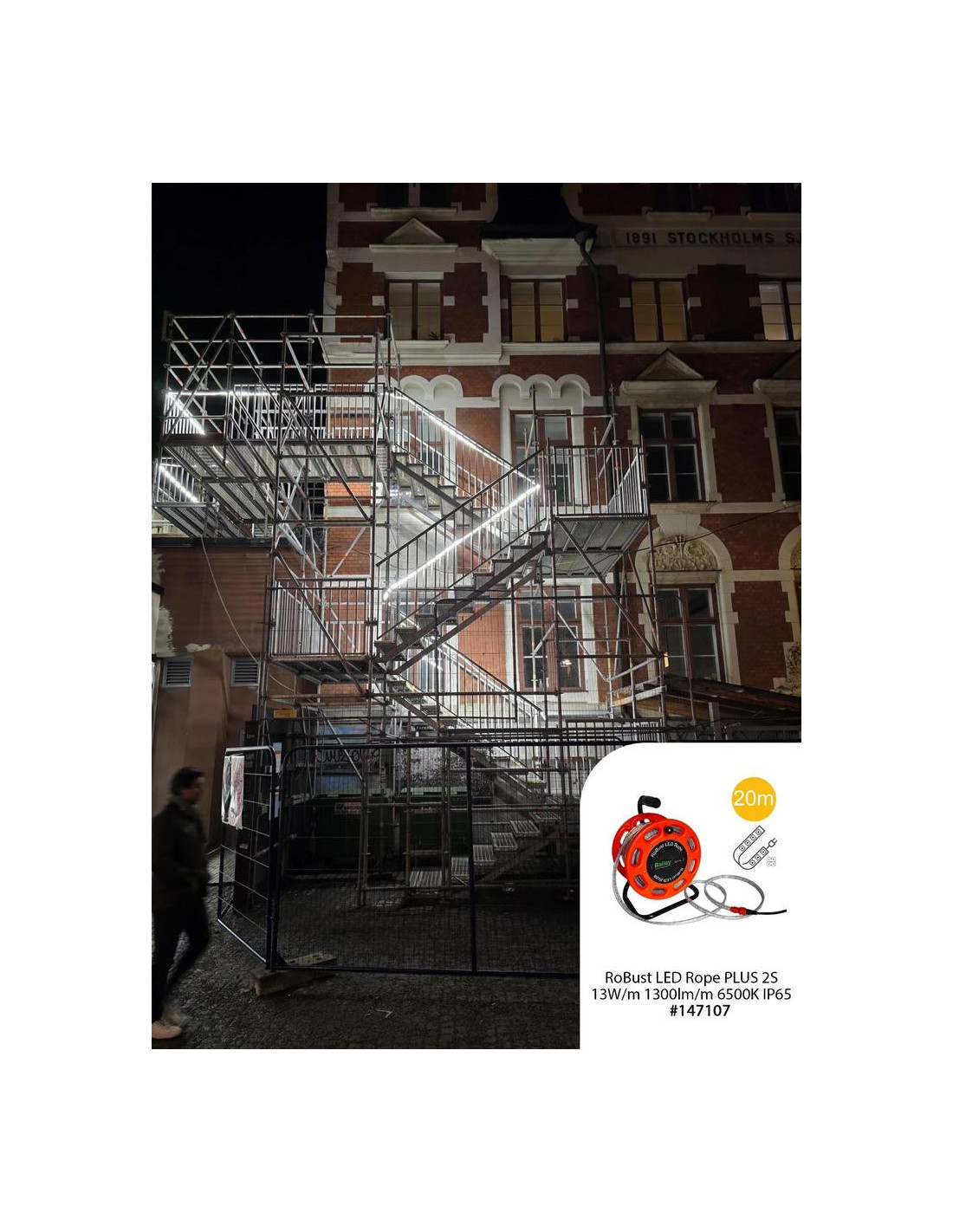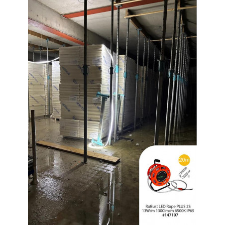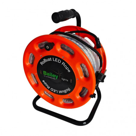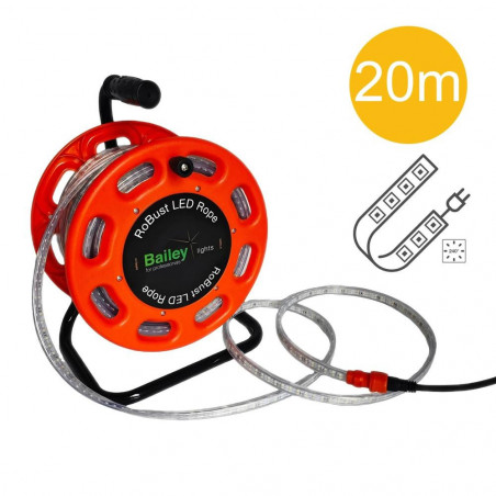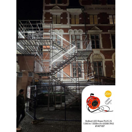 „Robust LED Rope Plus“ – galingas, patvarus ir lankstus darbo apšvietimas. „Robust LED Rope Plus 2S“ yra patikimos „Bailey Robust“ serijos dalis. Ši tvirta 20 metrų šviesos virvė specialiai sukurta statybvietėms, tamsioms vietoms ir pramoninėms darbo vietoms. Turėdama 360 šviesos diodų metre (1300 lm/m, 6500 K), ji užtikrina galingą, ryškų 240° darbo apšvietimą. Dėl lieto PVC korpuso šviesos virvė yra atspari smūgiams (IK10) ir visiškai atspari vandeniui (IP65). Virvė suvyniota ant išskirtinės ir praktiškos oranžinės ritės, todėl ją lengva pasiimti su savimi į kitą darbą. Virvę lengva prijungti ir ji tiekiama su 230 V maitinimo šaltiniu, įskaitant įmontuotą AC/DC adapterį ir 1,8 metro prijungimo laidą. Ją galima sutrumpinti naudojant standartinius PVC klijus ir atitinkamą galinį dangtelį. Galima įsigyti įvairių priedų: skirstytuvus, avarinį įrenginį, judesio jutiklį. Tinka temperatūrai nuo -20 °C iki +45 °C ir gali būti prijungta iki 100 m atstumu. Pastaba: prieš naudojimą visada visiškai išvyniokite, kad išvengtumėte perkaitimo.